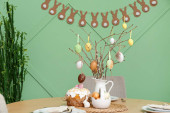 Wazon z gałęziami drzew i pisankami na stole przy szarej ścianie, zbliżenie