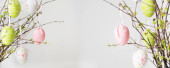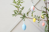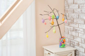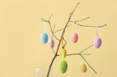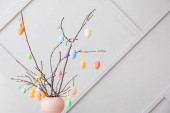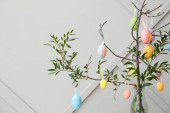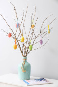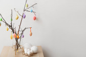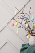 Wazon z gałęziami drzew i pisankami na stole przy szarej ścianie