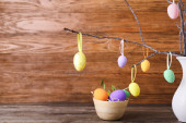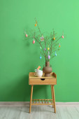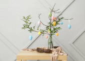 Zielone gałęzie drzew z jajkami wielkanocnymi i królikami na stole przy ścianie z cegły