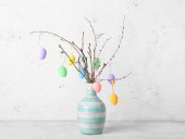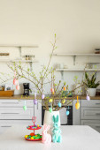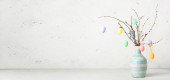 gałęzie drzew z różnych pisanek i stylowy wystrój na drewnianym stole
