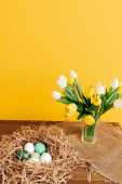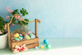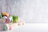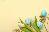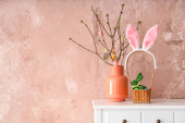 Skład z gałęzi drzew, pisanki, bukiet kwiatów i kalendarz kostki z datą 24 kwietnia na stole w pobliżu ściany kolor