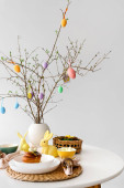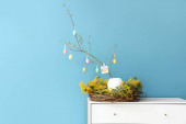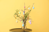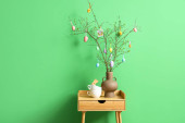 Wazon z gałęziami drzew i różne pisanki na drewnianym stole na tle koloru