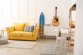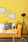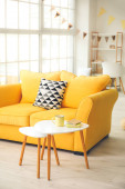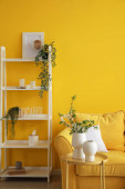 Wazon z gałęziami drzew i różne pisanki na drewnianym stole w pobliżu sofy we wnętrzu pokoju