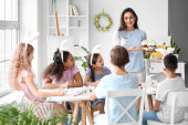 Cute little girl z króliczymi uszami i koszykiem wielkanocnym w sypialni