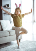 Cute little girl z króliczymi uszami i koszykiem wielkanocnym w domu