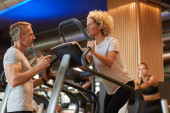 Grupa dziewcząt biegających na bieżni w słonecznej siłowni