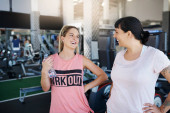 Wieloetniczne dziewczyny przytulają się i patrzą w kamerę na siłowni