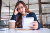 Zestresowana młoda bizneswoman azjatycka koncentruje się i martwi o swój projekt pracy w biurze. Męskie myślenie, zdenerwowanie na siebie.