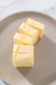 Składniki mieszania w dużej szklanej misce do mieszania do pieczenia bułeczek ajerkoniaku.