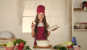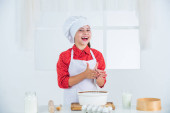 uśmiechnięta nastolatka dziewczyna w kucharz mundur gotowanie i pieczenie, piekarnia