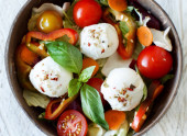 Włoski tricolore, małe kulki świeżego białego miękkiego włoskiego sera mozzarella, dojrzałe czerwone pomidory wiśniowe i świeże zielone zioła bazylii, gotowe do robienia sałatki caprese, zbliżenie.