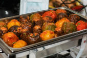 Zdjęcie "Smaczne świeże domowe pieczone ziemniaki serwowane na metalowej tacy. Z różnych ziół, masła, czosnku i soli. Szare kamienne tło. Widok z góry.." może być wykorzystywane do celów osobistych i komercyjnych zgodnie z warunkami zakupionej licencji Royalty-free. Obraz jest dostępny do pobrania w jakości wysokiej rozdzielczości do 5760x3840.
