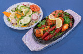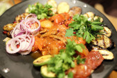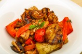 Palona papryka żółta i czerwona sałatka z kaparami i oliwkami w niebieski miska na białym tle. Grillowane warzywa.