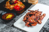 Zdjęcie "Pikantne gorące grillowane żeberka z grilla latem serwowane z ostrą papryką chili i świeżymi pomidorami na starej drewnianej desce do krojenia vintage." może być wykorzystywane do celów osobistych i komercyjnych zgodnie z warunkami zakupionej licencji Royalty-free. Obraz jest dostępny do pobrania w jakości wysokiej rozdzielczości do 5760x3840.