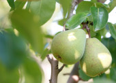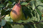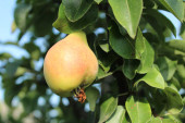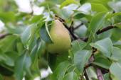 zieloną gruszkę z czerwoną stroną wiszącą na drzewie z liśćmi haebalu. Zbieranie owoców rośnie latem, gdy owoc gruszki rośnie. Rolnictwo ekologiczne.