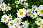 Kwiaty w ogrodzie letnim: liliowy erigeron i biały pyrethrum.