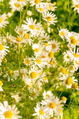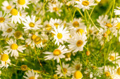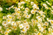 Pyrethrum parthenium (Złoty Mech) w słonecznym ogrodzie letnim