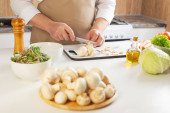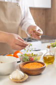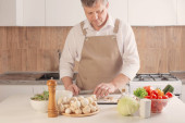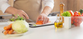 człowiek przygotowanie zdrowej żywności wegetariańskiej na stole w kuchni