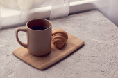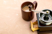 Facet wlewa kawę do kubka z gejzera. Wysokiej jakości zdjęcie
