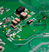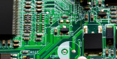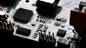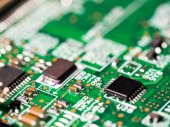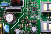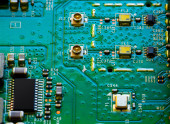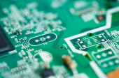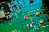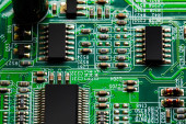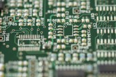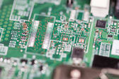Makro Zbliżenie podzespołów i mikroprocesorów na płytce obwodu PC.