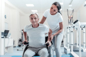 Wiek kobieta na siedzeniu sprzętu siłowni robi ćwiczenia ramion