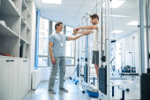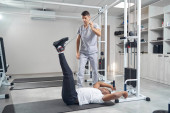 mężczyzna ciągnąc lewy noga emeryt z kabel maszyna