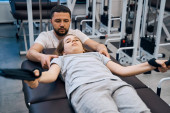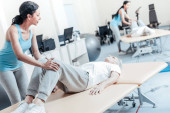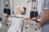 Starzejąca się kobieta podnoszenie nogi podczas doiung sportu na kablówce