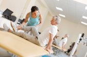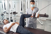 Starsza kobieta podnosząca nogi z kablówką pod nadzorem fizjoterapeuty
