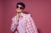 Portret młodej kobiety w beżowym różowym t-shircie Panama gesty dłoni Studio