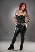 Glamour plus size model pokryty tatuażami w bieliźnie i skórze na szarym tle