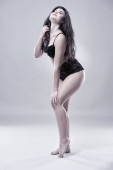 Piękny rozmiar plus kobieta z tatuażami w czarnej mini sukience, inkluzywność i akceptacja ciała