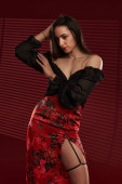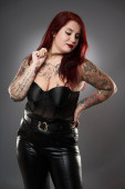 Piękny tatuaż duży (plus size) kobieta z tatuażami w czarnej spódnicy i czerwony biustonosz, inkluzywność i pozytywność ciała
