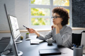 Zdjęcie "Afroamerykański audytor biurowy Korzystanie z arkusza kalkulacyjnego" może być wykorzystywane do celów osobistych i komercyjnych zgodnie z warunkami zakupionej licencji Royalty-free. Obraz jest dostępny do pobrania w jakości wysokiej rozdzielczości do 5760x3840.