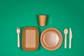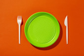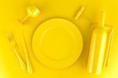 żółta jednorazowa zastawa stołowa na żółtym tle, dwa talerze, dwa kieliszki i sztućce, koncepcja dań i żywności