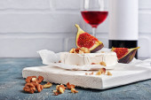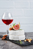 pieczony ser camembert z figami, tymiankiem, orzechami i miodem. kieliszek czerwonego wina