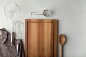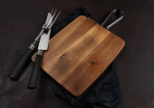 Drewniane miski i deski do krojenia na drewnianej półce przeciwko szorstkiemu tynkowi czarnej ściany. Sprzęt kuchenny rustykalny.