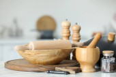 Zdjęcie "Drewniane miski i deski do krojenia na drewnianej półce przeciwko szorstkiemu tynkowi czarnej ściany. Sprzęt kuchenny rustykalny." może być wykorzystywane do celów osobistych i komercyjnych zgodnie z warunkami zakupionej licencji Royalty-free. Obraz jest dostępny do pobrania w jakości wysokiej rozdzielczości do 5760x3840.