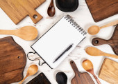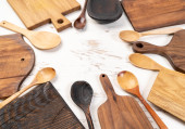 Drewniane miski i deski do krojenia na drewnianej półce przeciwko szorstkiemu tynkowi czarnej ściany. Sprzęt kuchenny rustykalny.