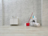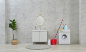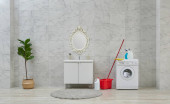 Zestawy czyszczące w łazience, biała szafa i umywalka, pralka.
