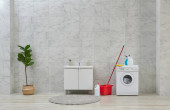 Zdjęcie "Zestawy czyszczące w łazience, biała szafa i umywalka, pralka." może być wykorzystywane do celów osobistych i komercyjnych zgodnie z warunkami zakupionej licencji Royalty-free. Obraz jest dostępny do pobrania w jakości wysokiej rozdzielczości do 5760x3840.