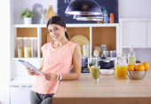 Uśmiechnięta młoda kobieta mieszająca świeżą sałatkę w kuchni.