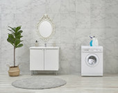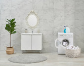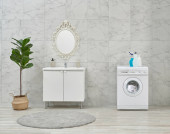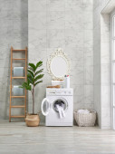 Pralka i szafa i umywalka w białej łazience, środki czystości, brudne ubrania w stylu koszyka.