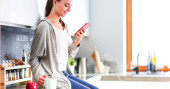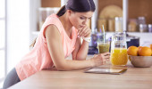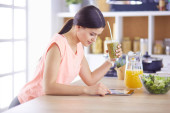 Uśmiechający się ładna kobieta, patrząc na telefon komórkowy i trzymając szklankę soku pomarańczowego, jedząc śniadanie w kuchni.