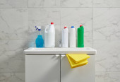 Zestawy czyszczące na zlewie w łazience, żółty materiał, zbliżenie.