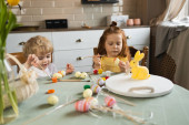 Portret skoncentrowanych radosnych dzieci dziewczynka, chłopiec, malarstwo, kolorowanki pisanki, stół kuchenny ze szczotkami