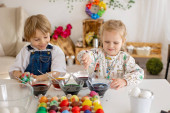 Zdjęcie "Portret skoncentrowanych radosnych dzieci dziewczynka, chłopiec, malarstwo, kolorowanki pisanki, stół kuchenny ze szczotkami" może być wykorzystywane do celów osobistych i komercyjnych zgodnie z warunkami zakupionej licencji Royalty-free. Obraz jest dostępny do pobrania w jakości wysokiej rozdzielczości do 5760x3840.