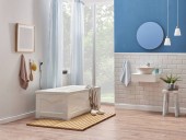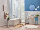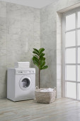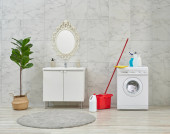 Pralka w łazience, zestawy do sprzątania, w stylu narożnym, obiekt dekoracyjny, ręcznik, szczotka, brudne ubrania.