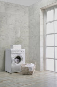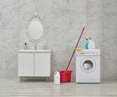Pralka w łazience, zestawy do sprzątania, w stylu narożnym, obiekt dekoracyjny, ręcznik, szczotka, brudne ubrania.