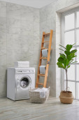 Pralka w łazience, w stylu rogu, obiekt dekoracyjny, ręcznik, szczotka, brudne ubrania.