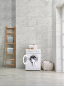 Pralka w łazience, zestawy do sprzątania, w stylu narożnym, obiekt dekoracyjny, ręcznik, szczotka, brudne ubrania.